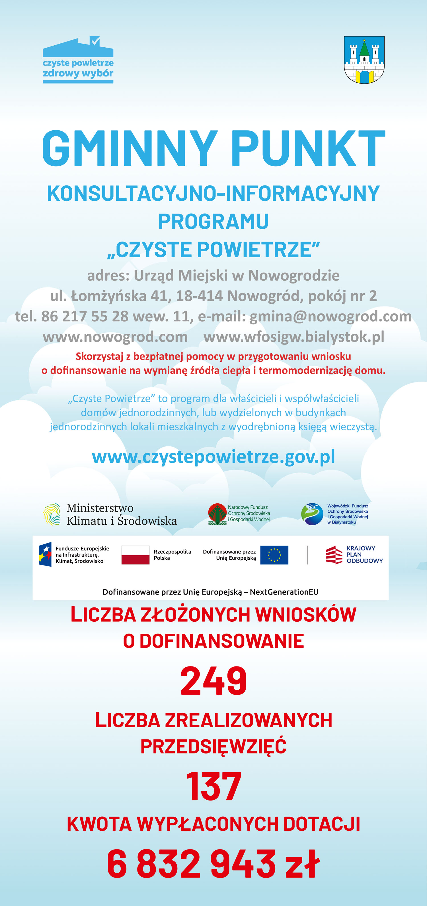 W Gminie Nowogród realizowany jest program ”Czyste Powietrze”, którego celem jest poprawa jakości powietrza w Polsce. Program daje możliwość otrzymania dotacji na wymianę starego źródła ciepła oraz termomodernizację domu jednorodzinnego.