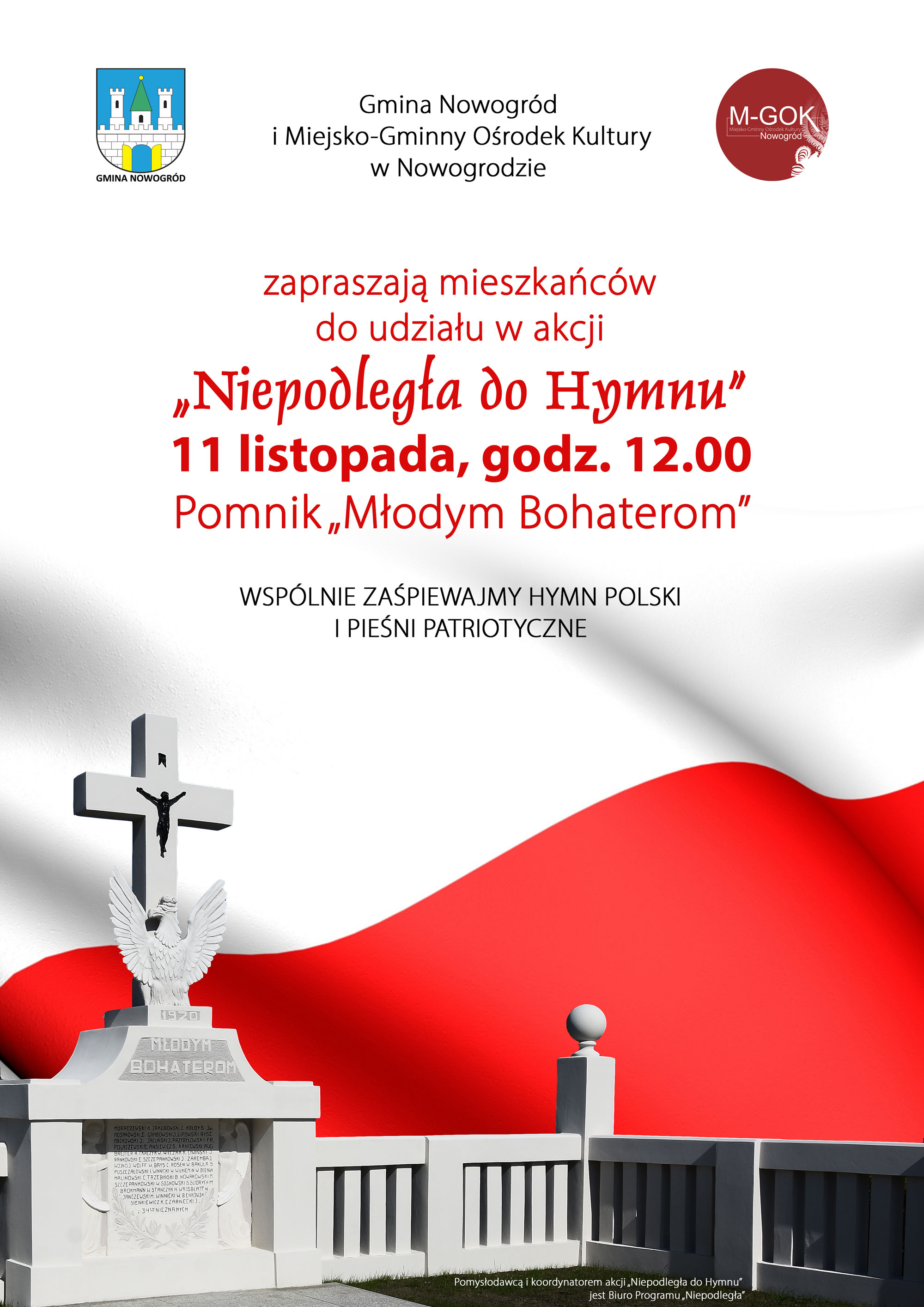 We wtorek 11 listopada Narodowe Święto Niepodległości. O godz. 12:00 zapraszamy mieszkańców na wspólne śpiewanie hymnu i pieśni patriotycznych przy Pomniku "Młodym Bohaterom".