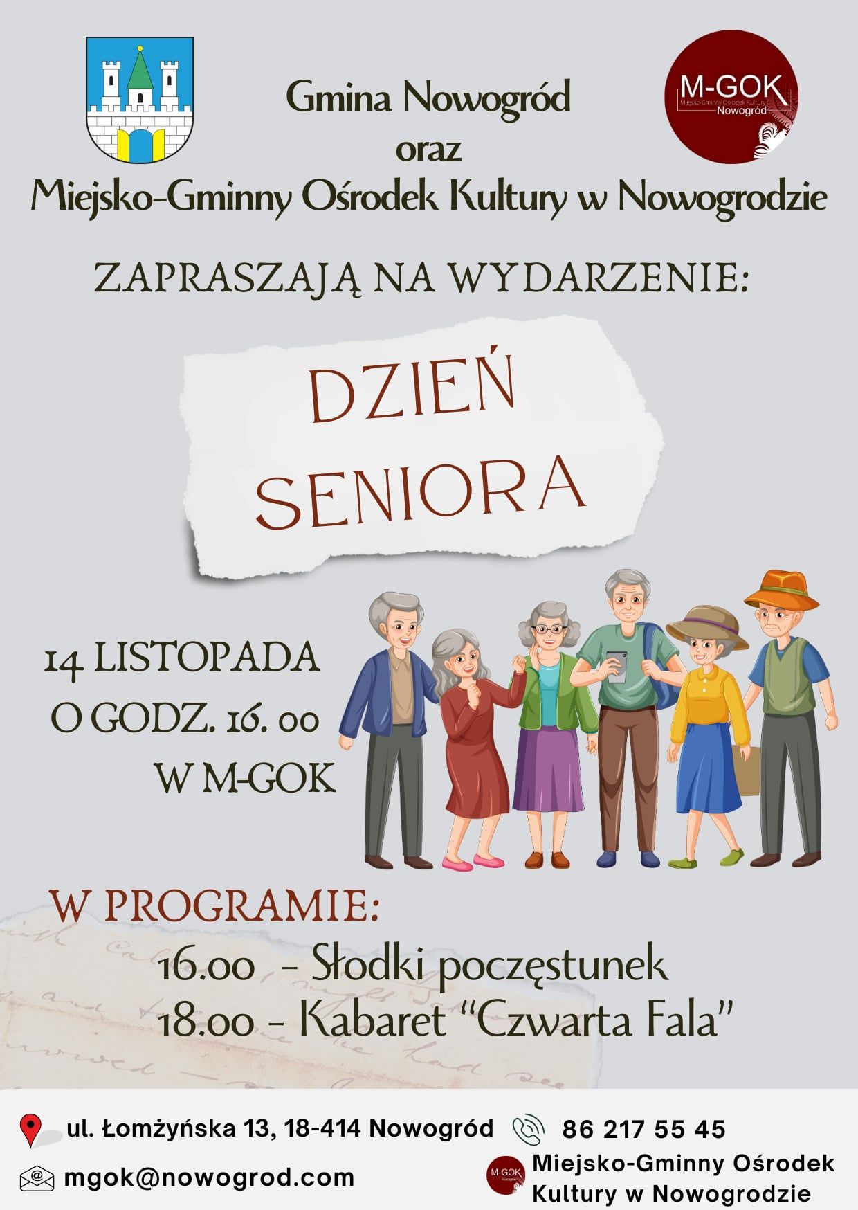 Już dzisiaj o godz. 16:00 Gmina Nowogród i Miejsko-Gminny Ośrodek Kultury w Nowogrodzie zapraszają na "Dzień Seniora"