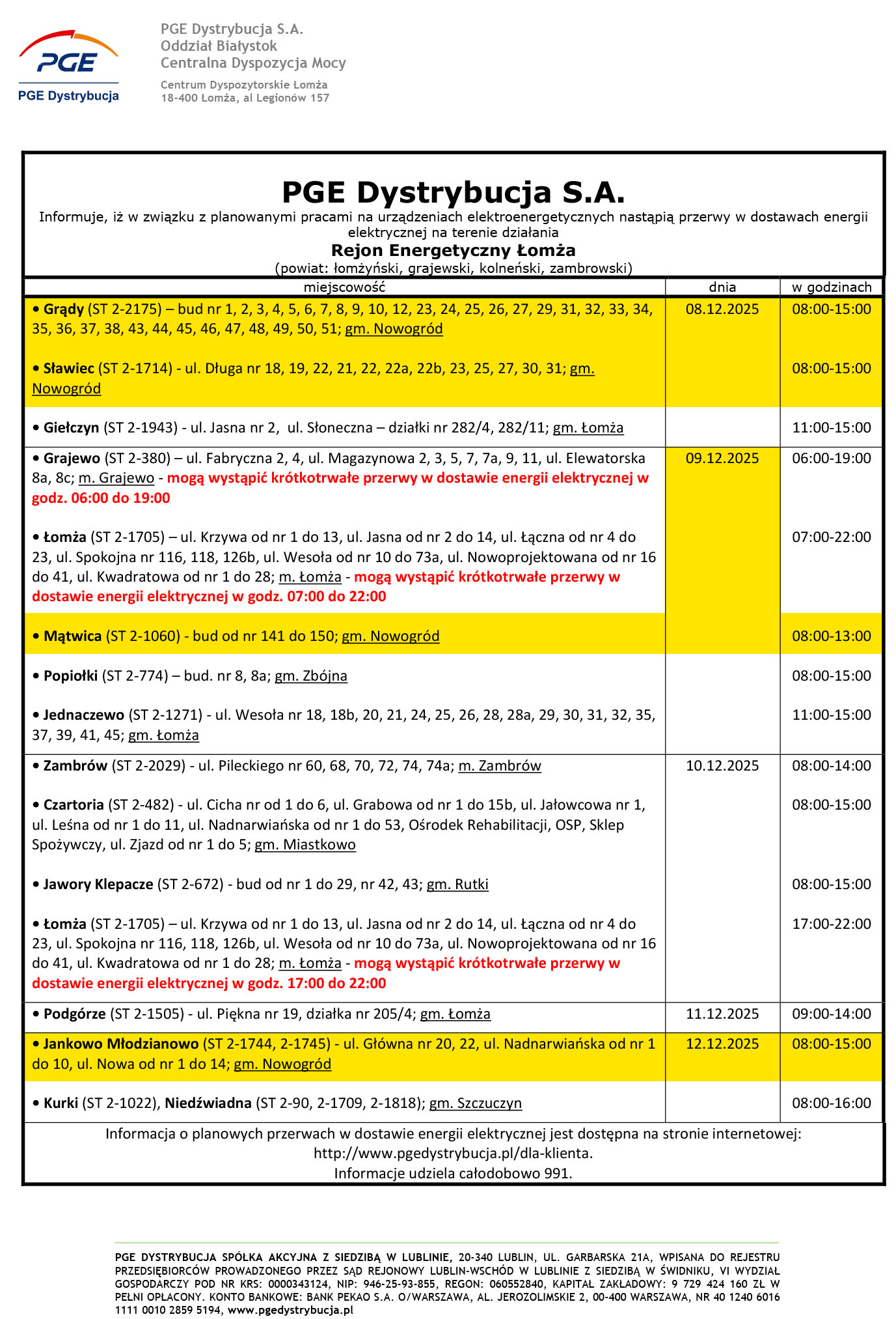 PGE Dystrybucja S.A. informuje o planowanych przerwach w dostawie energii elektrycznej.
