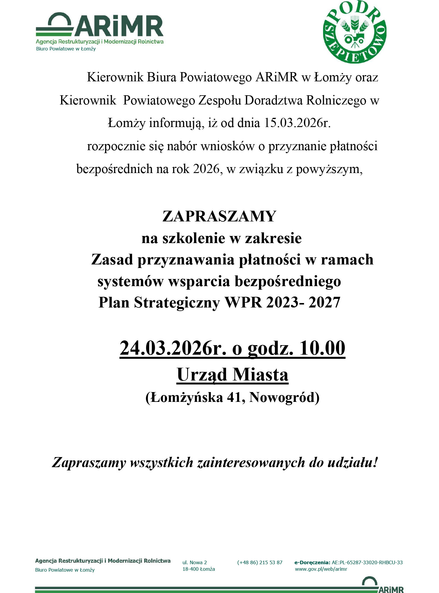 Kierownik Biura Powiatowego ARiMR w Łomży oraz Kierownik Powiatowego Zespołu Doradztwa Rolniczego w Łomży informują, iż od dnia 15.03.2026 r. rozpocznie się nabór wniosków o przyznanie płatności bezpośrednich na rok 2026, w związku z powyższym, zapraszamy na szkolenie w zakresie "Zasad przyznawania płatności w ramach systemów wsparcia bezpośredniego Plan Strategiczny WPR 2023- 2027", 24.03.2026 r. o godz. 10.00, Urząd Miejski (Łomżyńska 41, Nowogród)