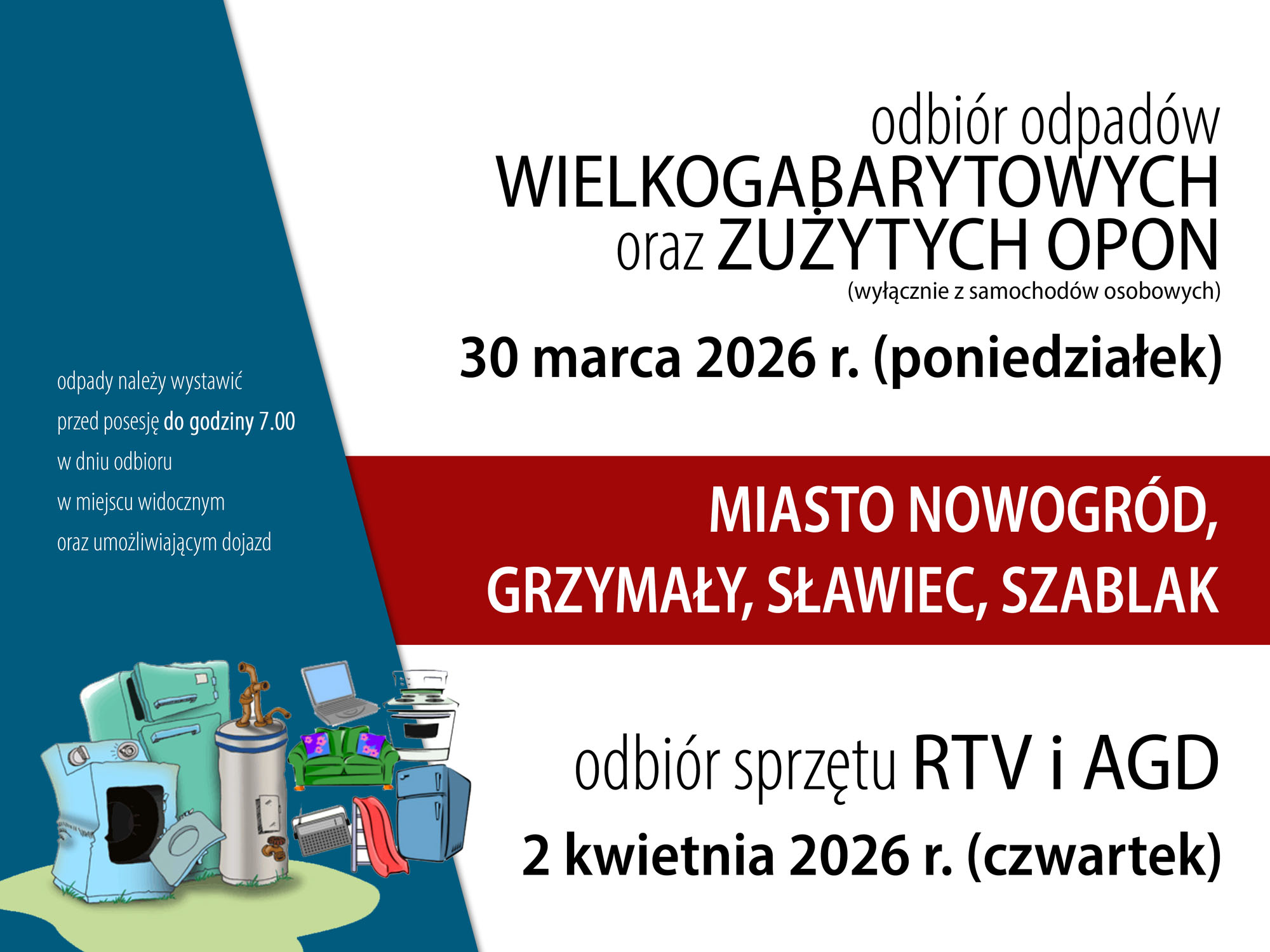 Przypominamy o zbliżających się terminach odbioru odpadów wielkogabarytowych, zużytych opon oraz sprzętu RTV i AGD